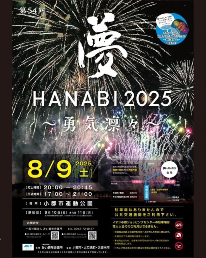 小郡市の夏の風物詩となっている花火大会「夢HANABI~勇気凛々~」が、今年も華々しく開催されます。澄んだ夜空を彩る約45分間の幻想的な花火ショーが、観客を非日常の世界へと誘います。