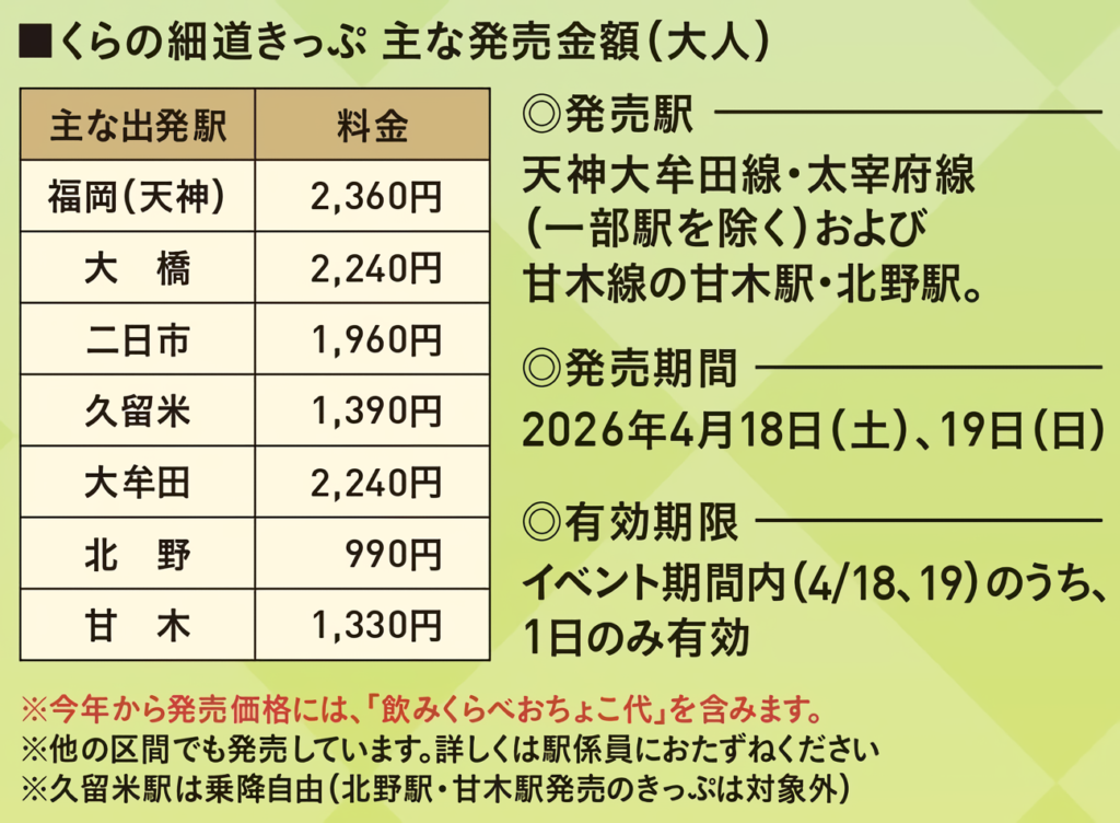【くらの細道きっぷ 発売金額(大人のみ)】