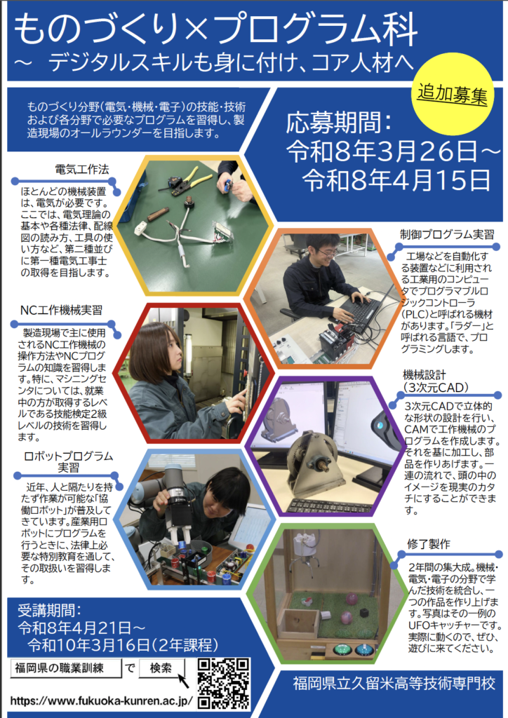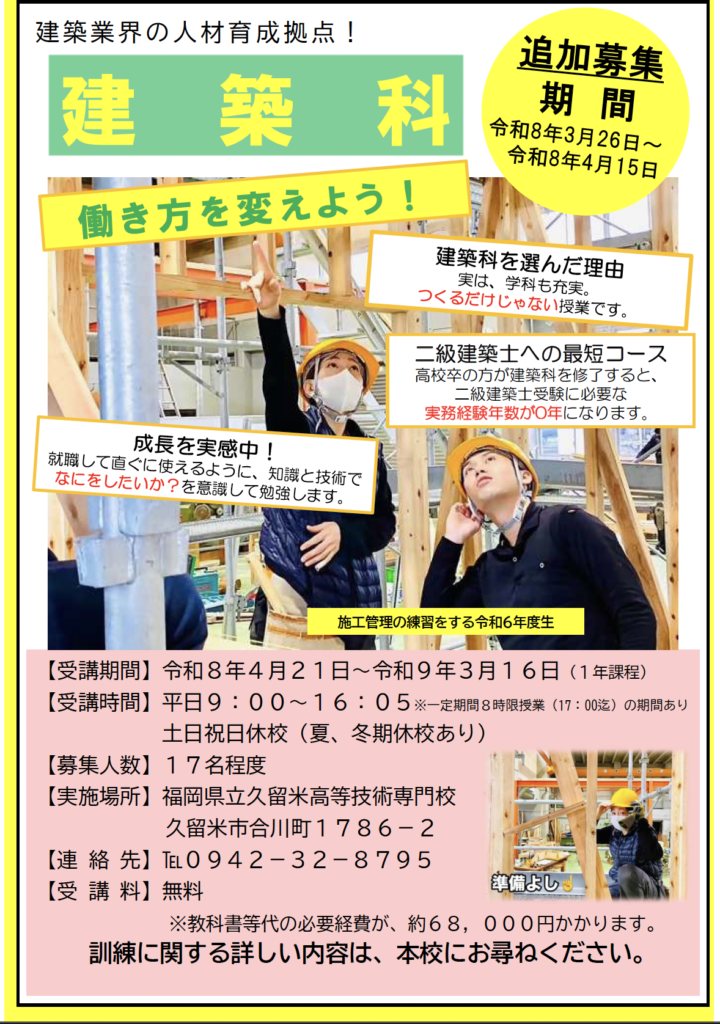 機器・装置の製造分野や、建築・不動産業界で活躍する人材を育成する職業訓練施設にて、令和8年度入校生の追加募集が3月26日(木)より開始されています。