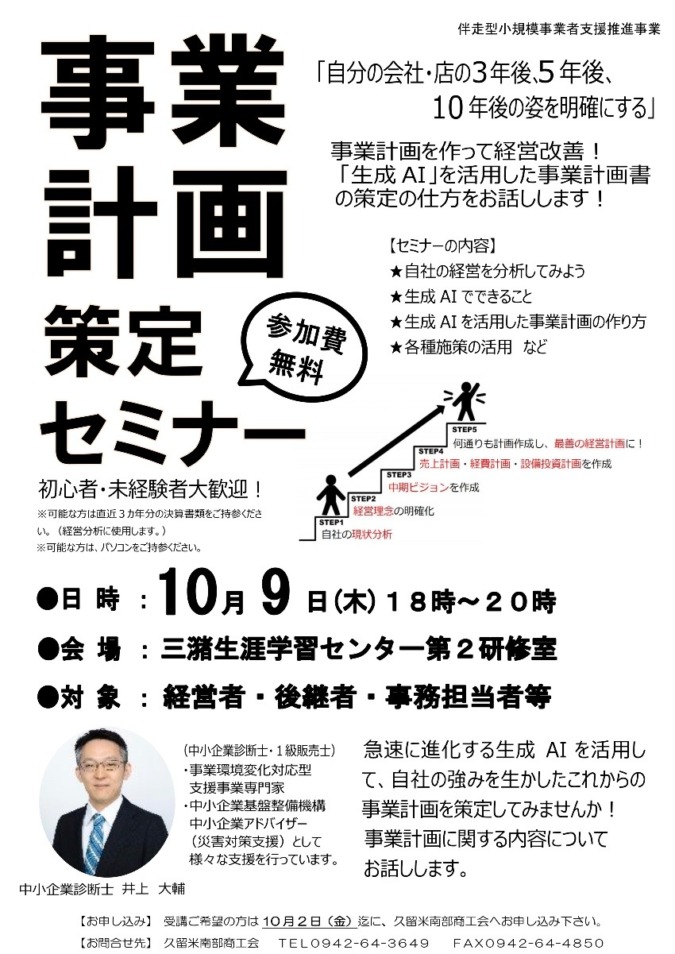 経営に伴う悩みを解決するなら、くるめ経営コンサルティングにお任せを。代表の井上さんは公的支援機関「商工会」で20年間、小規模事業者の支援に従事してきた中小企業診断士。販路開拓・資金繰り・人材育成など様々な課題解決をサポートしてきた一人です。とくに多くの経営者が面倒と感じているIT・会計分野を得意とし、事業計画書の作成など煩わしさからの解放に向けたヒントを指南してくれます。